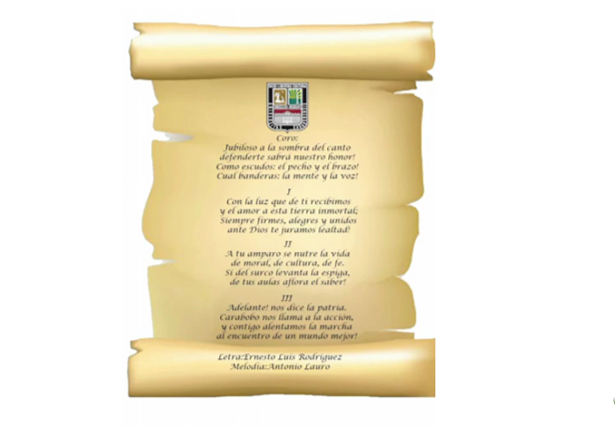 El Himno de la Universidad de Carabobo es producto de dos grandes talentos venezolanos: Música: Antonio Lauro Letra: Ernesto Luis Rodríguez. Este himno, que resuena en todos los actos protocolares de nuestra prestigiosa casa de estudios, representa la identidad y tradición universitaria.