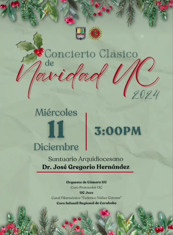 Este miércoles 11 de diciembre a partir de las 3 de la tarde, se estará presentando en el Santuario José Gregorio Hernández de Valencia, el Concierto Clásico de Navidad, así lo informó Maria Blanca Rodríguez, Directora de Cultura de la UC.