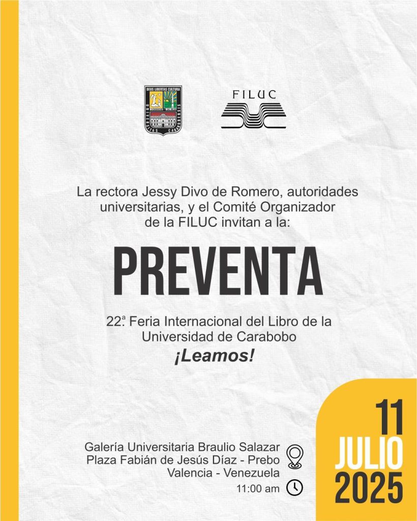La Feria Internacional del Libro de la Universidad de Carabobo (Filuc) realizará su Preventa 2025 este viernes 11 de julio, a las 11:00 am en los espacios de la Galería Universitaria Braulio Salazar, en la plaza Fabián de Jesús Díaz de Prebo.