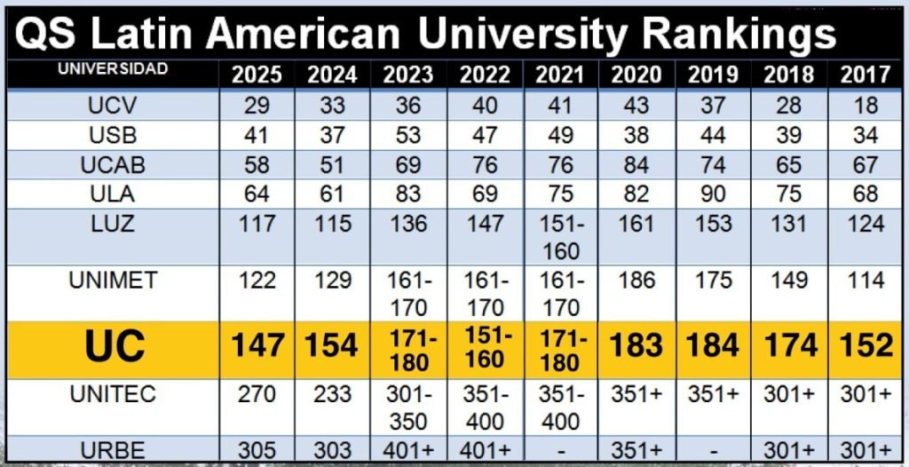 La Universidad de Carabobo, a pesar de a la adversidad, sigue estando entre las primeras 200 mejores casas de estudios superiores de América Latina, con una coherente actuación registrada desde el año 2017.