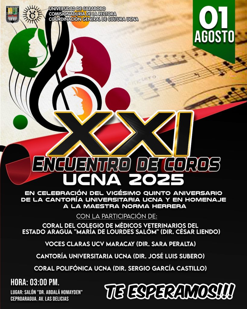 El XXI Encuentro de Coros UCNA 2025, contará con la participación de diversos coros universitarios, incluyendo el Coro de Colegio de Médicos Veterinarios, dirigido por César Liendo; la agrupación de voces claras del Campus Maracay de la UCV, bajo la dirección de Sara Peralta, la Coral Polifónica del Núcleo Aragua, dirigida por Sergio García y la anfitriona la Cantoría Universitaria UCNA. La invitación es abierta a toda la comunidad universitaria y aragüeña para celebrar y disfrutar de esta muestra cultural que es de entrada libre, y que refleja la riqueza artística y el compromiso de la universidad con la cultura en la entidad. N/P Nicolás Brizuela